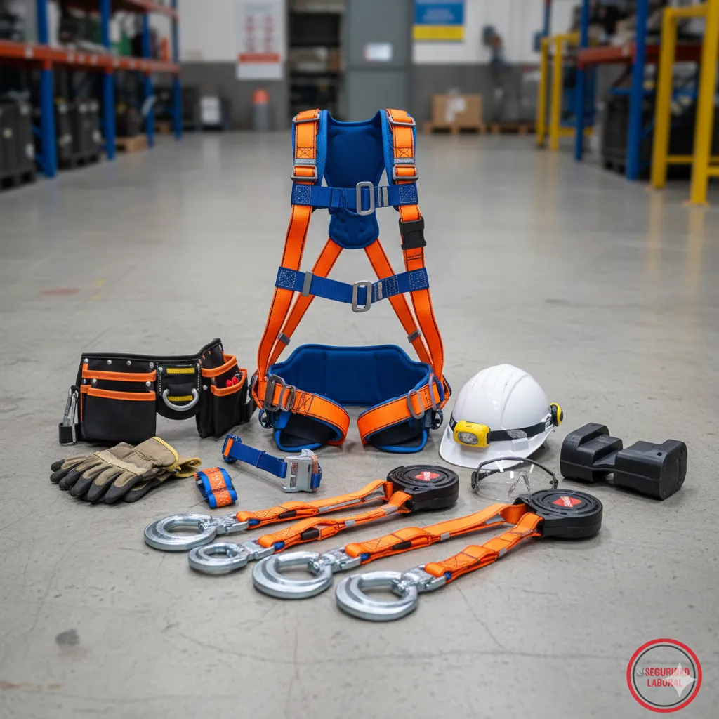 Arnés anticaídas, casco con barbuquejo, conectores, líneas de vida certificadas, puntos de anclaje adecuados y calzado de seguridad, todos con certificado de conformidad e inspección periódica.